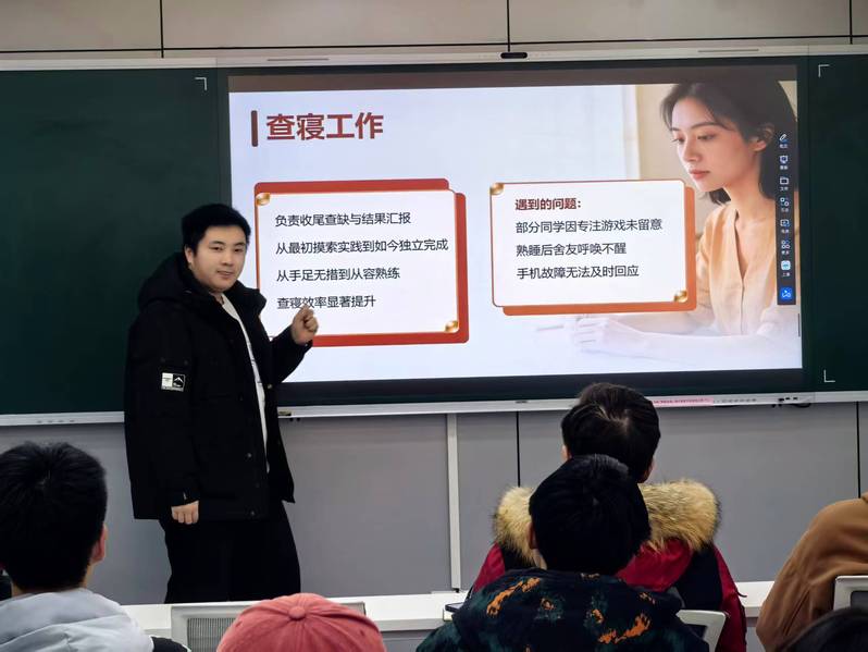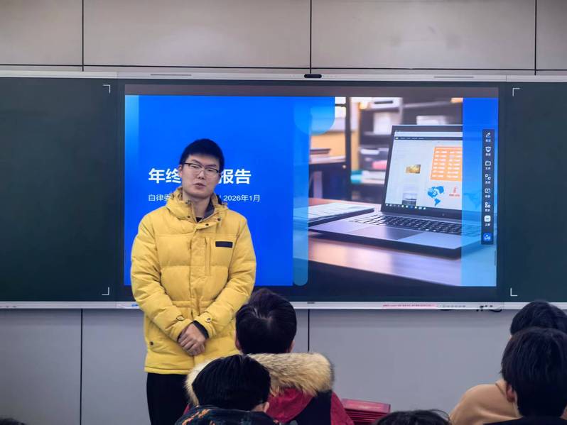 1月15日,信息工程学院学生自律委员会在四号公寓服务中心109室,举行年度述职暨表彰大会。自律委员会全体成员齐聚一堂,总结过往,表彰先进,共迎新春。 在述职环节,同学们依次上台,围绕本学年的核心职责——“晚寝巡查”“晚自习秩序维护”及“活动组织开展”进行了翔实汇报。同学们结合具体数据与工作实例,系统梳理了在服务同学、保障日常秩序过程中的付出、收获与反思,充分展现了严谨务实、乐于奉献的良好风貌。 为激励先进、凝聚力量,大会对过去一学期中工作表现优异、贡献突出的同学进行了表彰。游浩鹏老师为获表彰的同学颁发了荣誉证书。这份认可,既是对他们辛勤工作的肯定,也为全体成员树立了学习的榜样。 指导老师游浩鹏在总结讲话中对全体成员的辛勤付出表示感谢。他勉励大家在工作中持续提升服务意识与责任担当,在学业上追求卓越,在生活中互帮互助,共同成长。新春将至,游老师也代表学院向同学们送上美好祝福,祝愿大家学业进步、前程似锦。 大会在热情洋溢的掌声中圆满落幕。展望未来,信息工程学院自律委员会全体成员将以更饱满的热情、更务实的作风,为学院学风建设和同学们成长成才贡献青春力量。